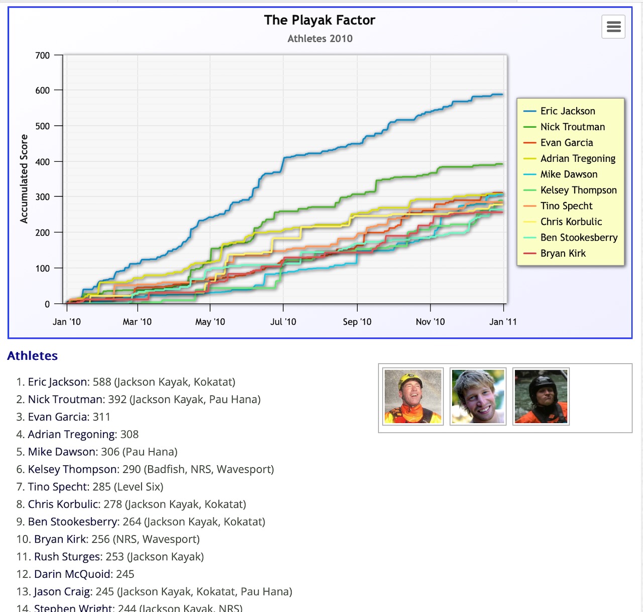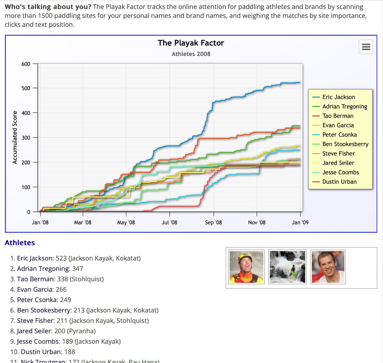 Playak Newsflash started the same year I sold my first Jackson Kayaks, in 2004. Jeoren Houttuin from Austria created this service and did some awesome things with it. First off, instead of the New York Times every morning, I got the Playak Newsflash, which was a collated list of web articles and blogs that were relevant to whitewater kayaking. My website, jacksonkayak.com was my personal blogspot from 2001-2003, and when we created World Kayak as a community-building online location for paddlers we had two websites that fed the Playak News Flash on a regular basis. Jeroen had a great concept and it really provided a lot of value to both the everyday paddler and to people in the paddling business. A service that Playak offered was to see your rankings as a business for online presence and the rankings of your team members. I am a competitor and also recognize that if you want to sell something you need to be seen and with Jackson Kayak (and World Kayak) I chose to sell my kayaks by having paddlers in my boats that could not only show them off personally, but if I gave them a voice online, that they would write blogs with photos and videos to showcase our kayaks in action. While I got a lot of grief from my competitors for having a very large team at JK, I had a large number of awesome paddlers writing about their exploits and the kayaks and Playak shared their blogs on the Playak Newsflash for thousands to see.